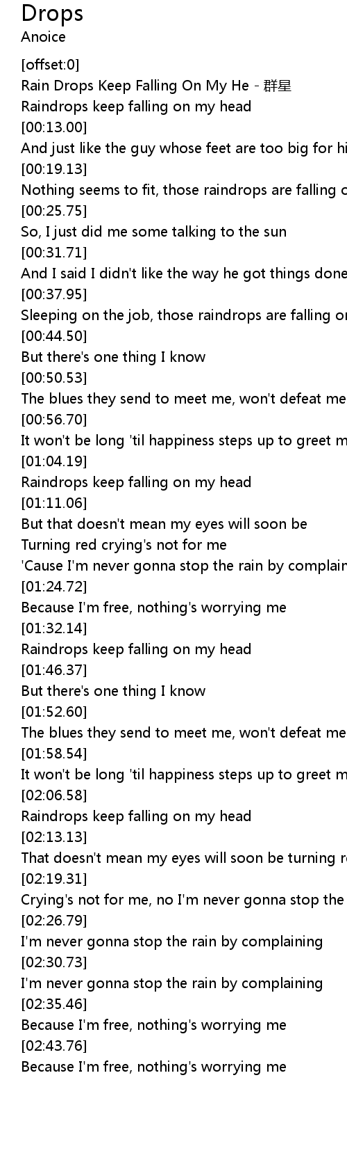 | [00:10.32] | Raindrops keep falling on my head |