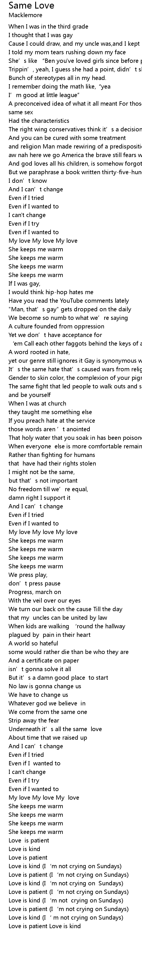 | [05:05.590] | Love is patient I' m not crying on Sundays |