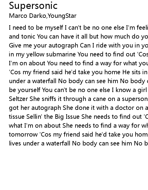 I need to be myself I can't be no one else I'm feeling supersonic Give me gin and tonic You can have it all but how much do you want it? You make me laugh Give me your autograph Can I ride with you in your B.M.W ? You can sail with me in my yellow submarine You need to find out 'Cos no one's gonna tell you what I'm on about You need to find a way for what you want to say But before tomorrow 'Cos my friend said he'd take you home He sits in a corner all alone He lives under a waterfall No body can see him No body can ever hear him call You need to be yourself You can't be no one else I know a girl called Elsa She's into Alka Seltzer She sniffs it through a cane on a supersonic train She made me laugh I got her autograph She done it with a doctor on a helicopter She's sniffin in her tissue Sellin' the Big Issue She needs to find out 'Cos no one's gonna tell you what I'm on about She needs to find a way for what she wants to say But before tomorrow 'Cos my friend said he'd take you home He sits in a corner all alone He lives under a waterfall No body can see him No body can ever hear him call |