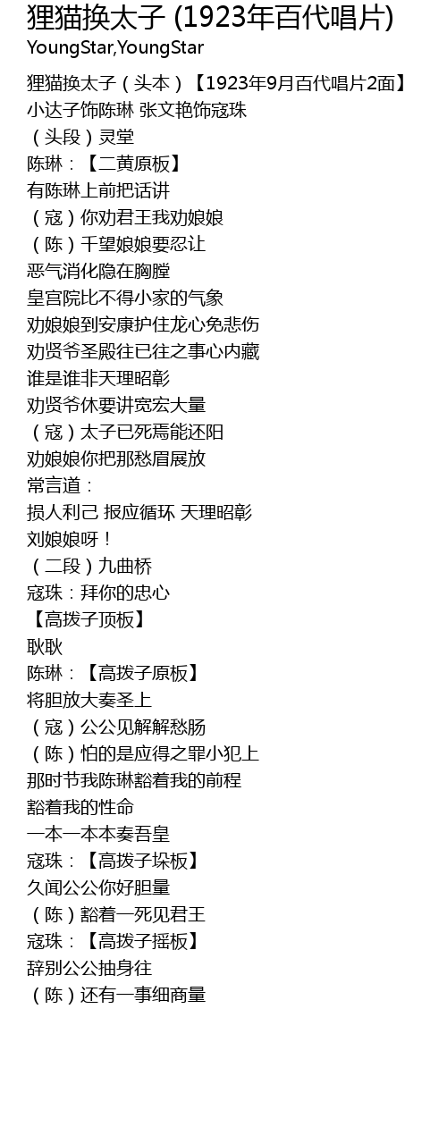 | [00:00.30] | 狸猫换太子(头本)【1923年9月百代唱片2面】 |