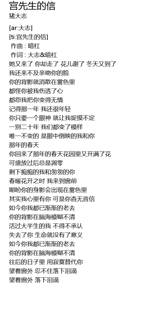 | [00:01.00] | 作词 : 大志&暗杠 |