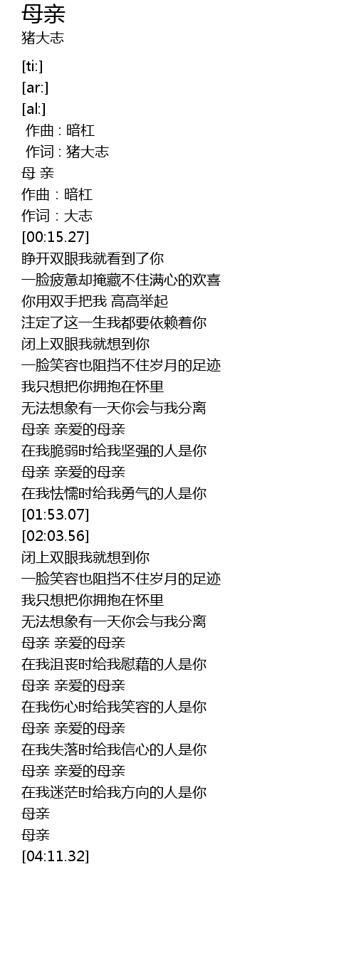 | [03:30.79] | 母亲 亲爱的母亲 |