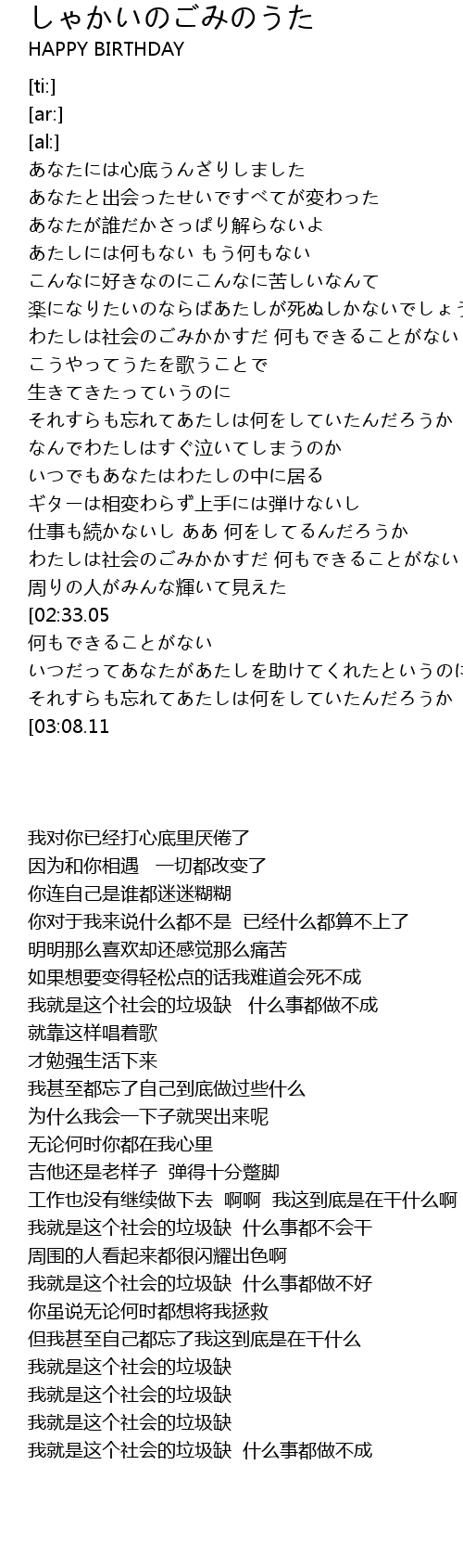 | [03:16.85][03:08.11][02:59.44] | わたしは社会のごみかかすだ |