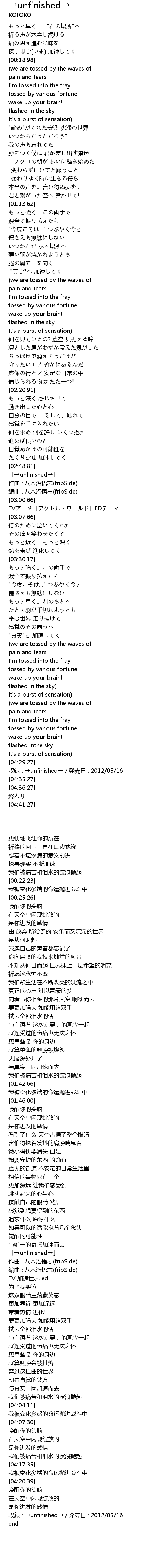 | [04:30.27] | 収録∶→unfinished→/発売日∶2012/05/16 |