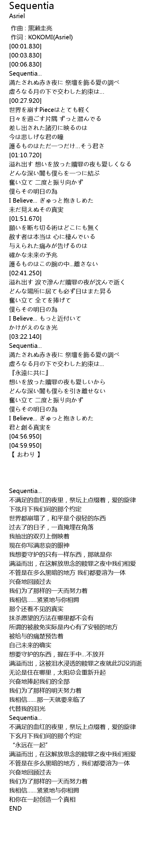 | [03:58.690] | 満たされぬ赤き夜に 祭壇を飾る愛の調べ |
