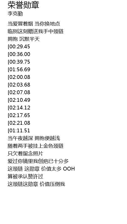 | [03:09.46][02:14.12][01:01.42] | 荣誉是极亮丽勋章一个 |