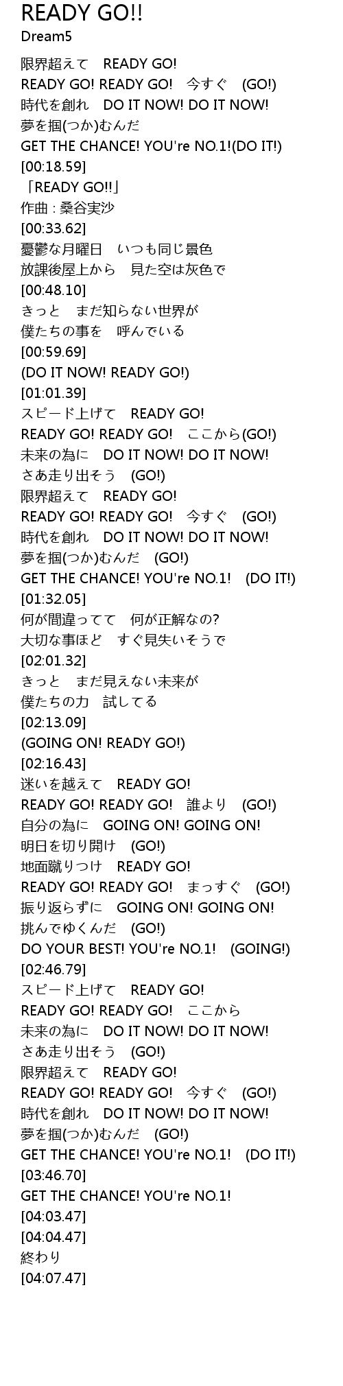| [02:34.04] | READY GO! READY GO! まっすぐ (GO!) |