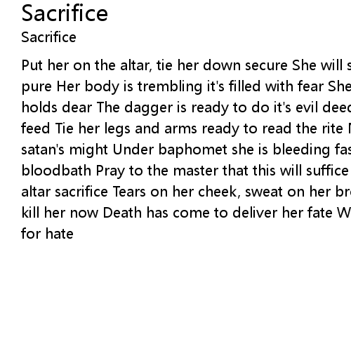 Put her on the altar, tie her down secure She will soon die, her soul is still pure Her body is trembling it's filled with fear She'll lose the life which she holds dear The dagger is ready to do it's evil deed On her decayed corpse I will feed Tie her legs and arms ready to read the rite Now I feel the force of satan's might Under baphomet she is bleeding fast With the corpse indulge in a bloodbath Pray to the master that this will suffice Split her skull for this altar sacrifice Tears on her cheek, sweat on her brow It's time to die I will kill her now Death has come to deliver her fate We don't do it for love we do it for hate |