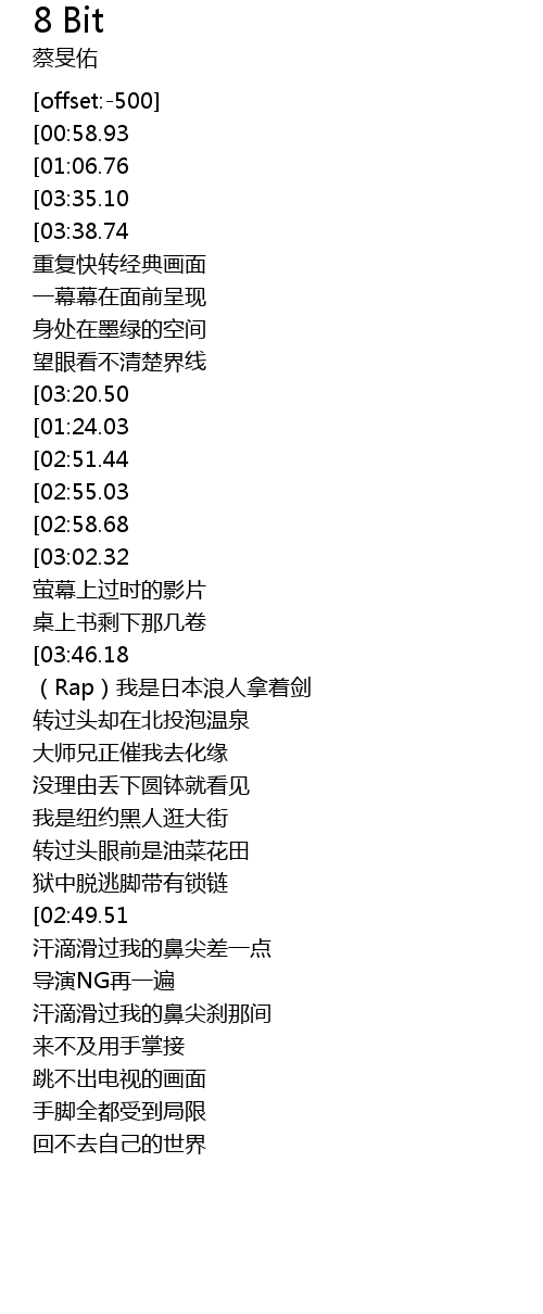 | [00:11.00][00:58.93][01:56.98] | 蔡�佑-8 Bit |