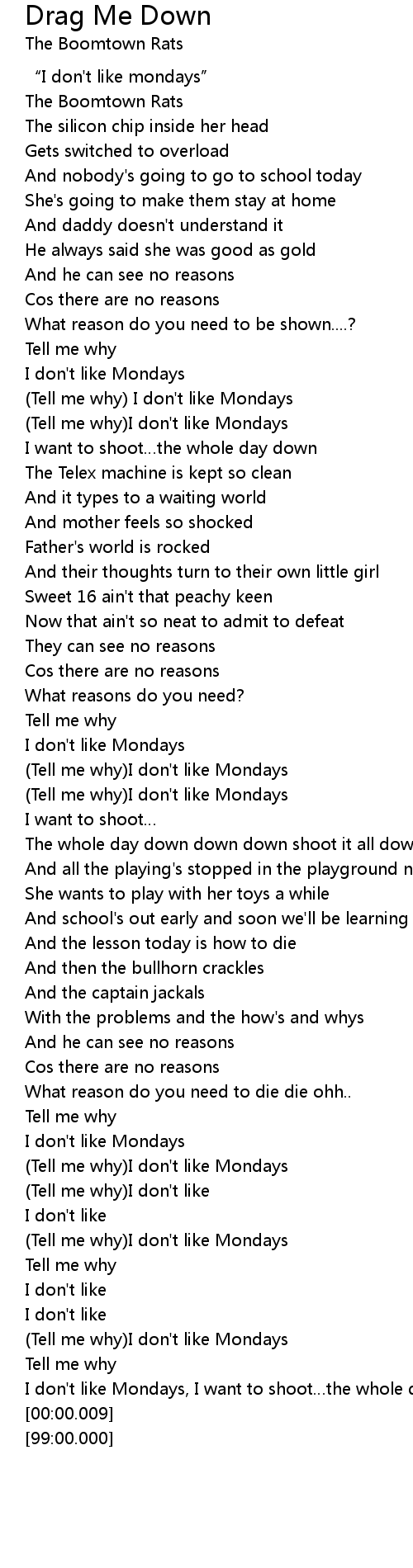 | [00:57.39] | Tell me why I don' t like Mondays |