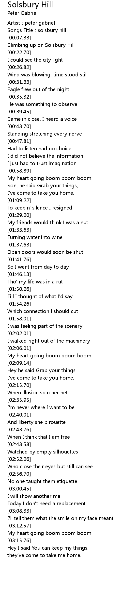 | [00:20.45] | Climbing up on Solsbury Hill |