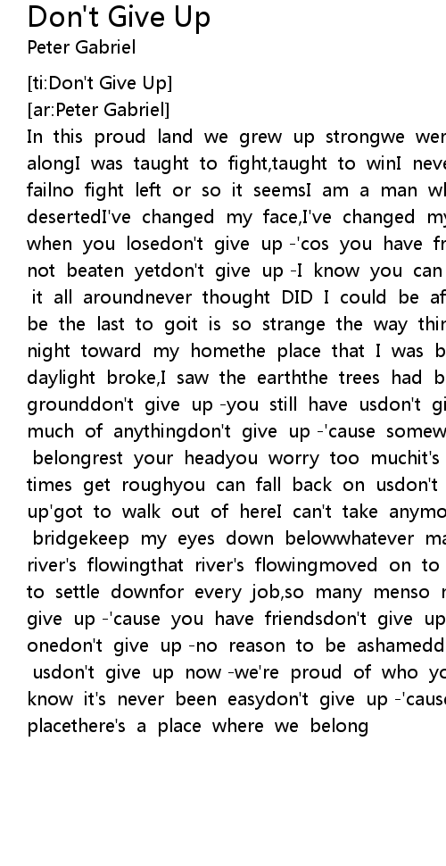 In this proud land we grew up strongwe were wanted all alongI was taught to fight,taught to winI never thought I could failno fight left or so it seemsI am a man whose dreams have all desertedI've changed my face,I've changed my namebut no one wants you when you losedon't give up -'cos you have friendsdon't give up -you're not beaten yetdon't give up -I know you can make it goodthough I saw it all aroundnever thought DID I could be affectedthought that we'd be the last to goit is so strange the way things turndrove the night toward my homethe place that I was born,on the lakesideas daylight broke,I saw the earththe trees had burned down to the grounddon't give up -you still have usdon't give up -we don't need much of anythingdon't give up -'cause somewhere there's a placewhere we belongrest your headyou worry too muchit's going to be alrightwhen times get roughyou can fall back on usdon't give upplease don't give up'got to walk out of hereI can't take anymoregoing to stand on that bridgekeep my eyes down belowwhatever may comeand whatever may gothat river's flowingthat river's flowingmoved on to another towntried hard to settle downfor every job,so many menso many men no-one needsdon't give up -'cause you have friendsdon't give up -you're not the only onedon't give up -no reason to be ashameddon't give up -you still have usdon't give up now -we're proud of who you aredon't give up -you know it's never been easydon't give up -'cause I believe there's?a placethere's a place where we belong |