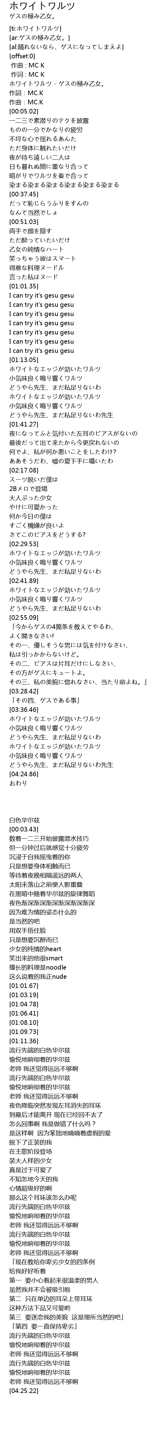 | [00:00.54] | ホワイトワルツ - ゲスの極み乙女。 |