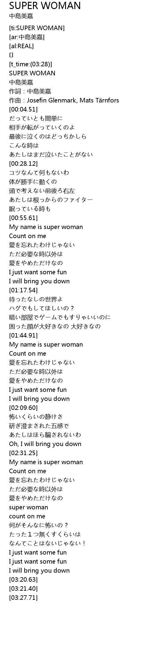 | [00:56.11] | My name is super woman |