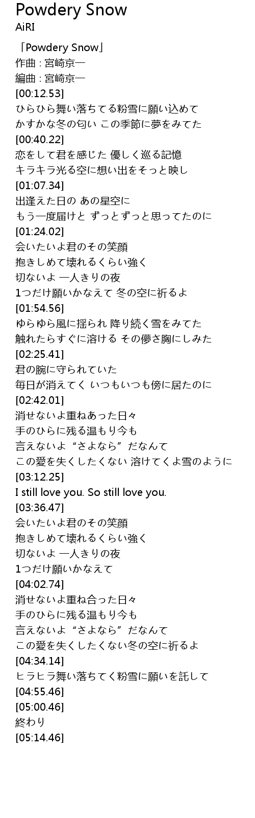 | [00:14.53] | ひらひら舞い落ちてる粉雪に願い込めて |