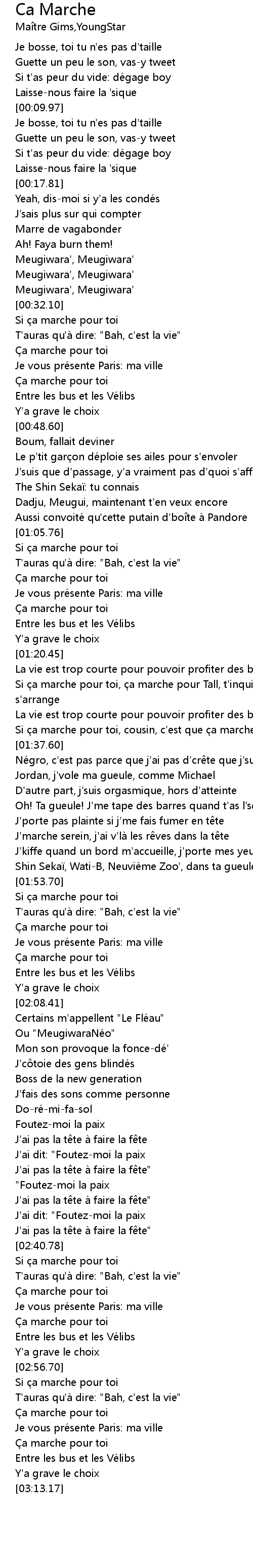 | [00:56.13] | J'suis que d'passage, y'a vraiment pas d'quoi s'affoler |