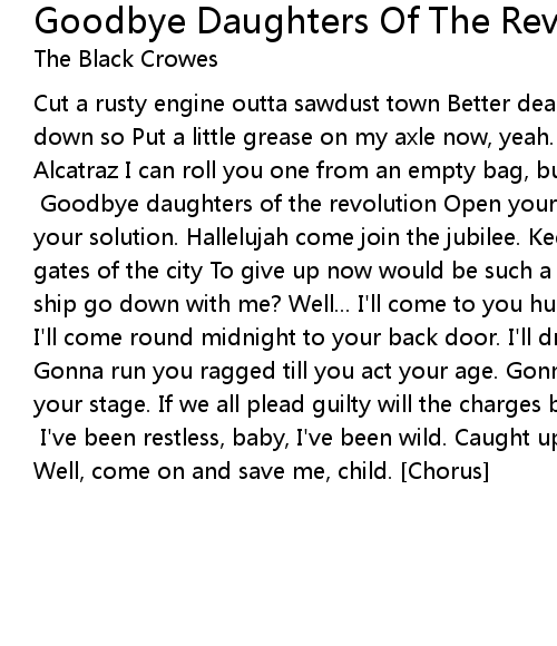 Cut a rusty engine outta sawdust town Better deal with the man who shook 'em all down so Put a little grease on my axle now, yeah. I been from Antioch to Alcatraz I can roll you one from an empty bag, but let's Take it easy to avoid any snags. [Chorus:] Goodbye daughters of the revolution Open your eyes and see your solution. Hallelujah come join the jubilee. Keep on runnin' through the gates of the city To give up now would be such a pity Don't you wanna see the ship go down with me? Well... I'll come to you hungry I'll come to you sore. I'll come round midnight to your back door. I'll drag my tail across your floor. Gonna run you ragged till you act your age. Gonna circle the wagons gonna storm your stage. If we all plead guilty will the charges be the same? [Chorus] [Bridge] I've been restless, baby, I've been wild. Caught up in a fever dream Well, come on and save me, child. [Chorus]