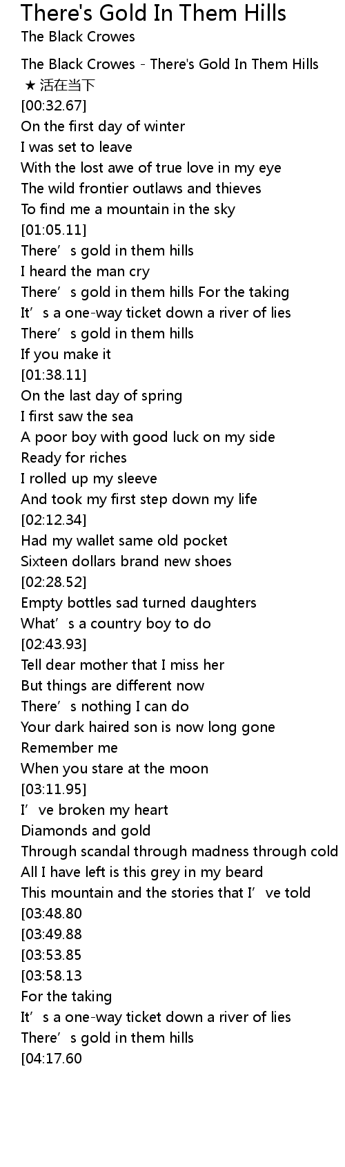 | [00:01.28] | The Black Crowes There' s Gold In Them Hills |