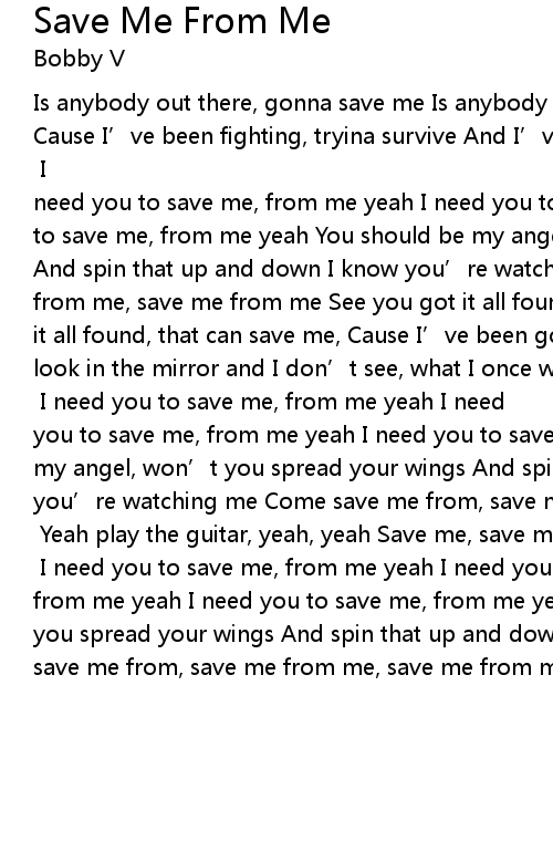 | Is anybody out there, gonna save me Is anybody out there, that can save me? Cause I' ve been fighting, tryina survive And I' ve been hurting, just tryina get by Is anybody, anybody out there Hear me calling down, oh yeha Chorus I need you to save me, from me yeah I need you to save me, from me yeah I need you to save me, from me yeah You should be my angel, won' t you spread your wings And spin that up and down I know you' re watching me Come save me from, save me from me, save me from me See you got it all found, that can save me, See you got it all found, that can save me, Cause I' ve been going through some changes I look in the mirror and I don' t see, what I once was And I' m so scared, can anybody out there hear me? Chorus I need you to save me, from me yeah I need you to save me, from me yeah I need you to save me, from me yeah You should be my angel, won' t you spread your wings And spin that up and down I know you' re watching me Come save me from, save me from me, save me from me Guitar solo Yeah play the guitar, yeah, yeah Save me, save me, save me, save me whoa Save me! Chorus I need you to save me, from me yeah I need you to save me, from me yeah I need you to save me, from me yeah You should be my angel, won' t you spread your wings And spin that up and down I know you' re watching me Come save me from, save me from me, save me from me Save me, save me, whoa, save me. |
