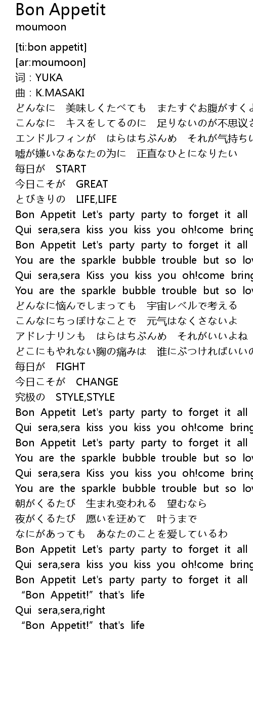 | [04:06.51] | Bon Appetit Let' s party party to forget it all |