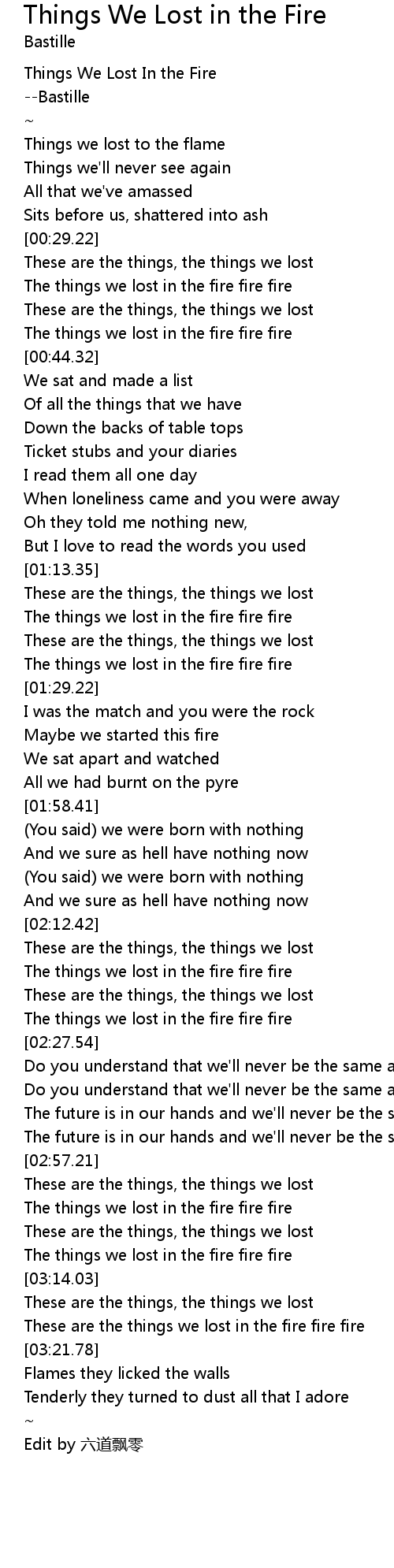 | [03:17.58] | These are the things we lost in the fire fire fire |
