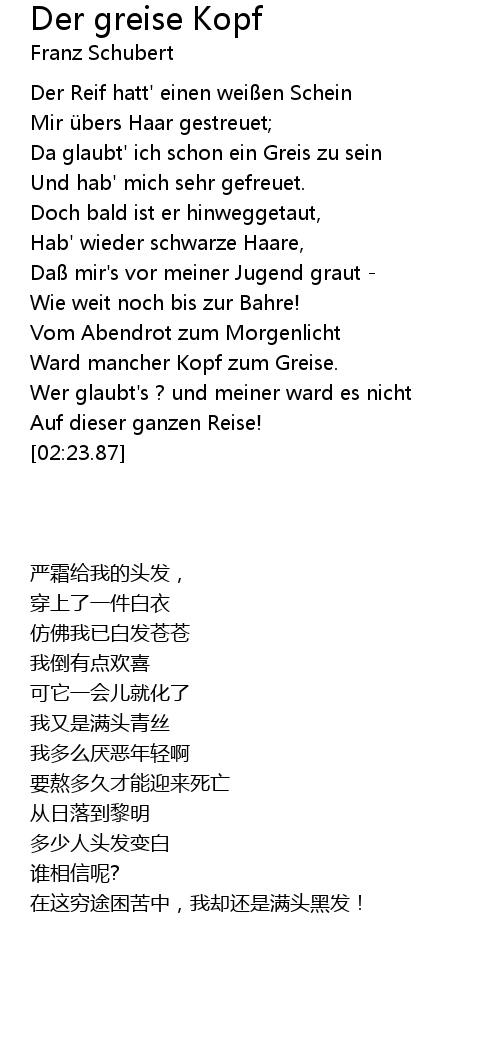 | [01:46.44] | Ward mancher Kopf zum Greise. |
