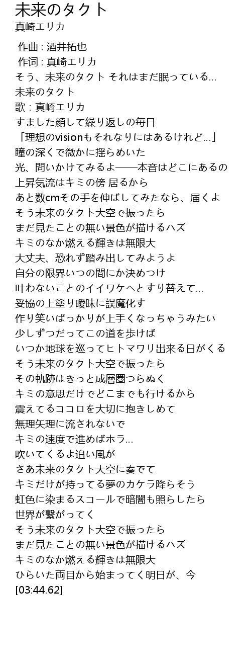 | [00:01.79] | そう、未来のタクト それはまだ眠っている… |