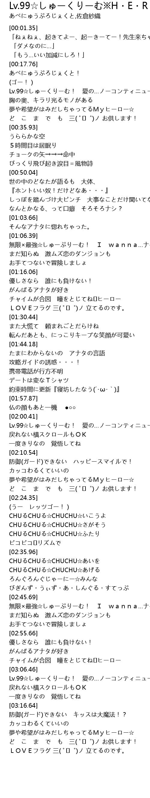 | [02:00.76] | Lv.99☆しゅーくりーむ! 愛の…ノーコンティニュー♪ |