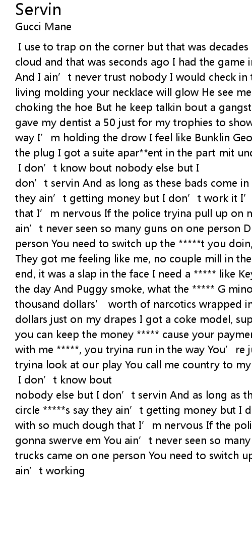 | Verse 1 I use to trap on the corner but that was decades ago I was high as a cloud and that was seconds ago I had the game in the lock a couple records ago And I ain' t never trust nobody I would check in the door And if you spend a living molding your necklace will glow He see me textin the phone and I ain' t choking the hoe But he keep talkin bout a gangsta, he put fault in the hoe I gave my dentist a 50 just for my trophies to show I look like Pablo Escobar the way I' m holding the drow I feel like Bunklin George, I got so many bills from the plug I got a suite apar ent in the part mit under the rug And every drank in my frigerator filled up with mud Hook I don' t know bout nobody else but I don' t servin And as long as these bads come in I' m gonna circle s say they ain' t getting money but I don' t work it I' m runnin with so much dough that I' m nervous If the police tryina pull up on me I' m gonna swerve em You ain' t never seen so many guns on one person Dump truck, 2 trucks came on one person You need to switch up the t you doin, just ain' t working Verse 2 They got me feeling like me, no couple mill in the safe But when snitched at the end, it was a slap in the face I need a like Key a, shout your mill of the day And Puggy smoke, what the G minor put some trust in the J 13 thousand dollars' worth of narcotics wrapped in some tape I spent 130 thousand dollars just on my drapes I got a coke model, supermodel feedin me grapes And you can keep the money cause your payment too late And you ain' t coming with me , you tryina run in the way You' re just a spy telling lies, tryina look at our play You call me country to my face, I hit your ass with this K Tomahawk, chop your head off, home of the brave Hook I don' t know bout nobody else but I don' t servin And as long as these bads come in I' m gonna circle s say they ain' t getting money but I don' t work it I' m runnin with so much dough that I' m nervous If the police tryina pull up on me I' m gonna swerve em You ain' t never seen so many guns on one person Dump truck, 2 trucks came on one person You need to switch up the t you doin, just ain' t working |