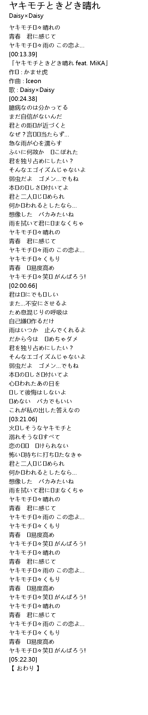 | [00:15.38] | 「ヤキモチときどき晴れ feat. MiKA」 |