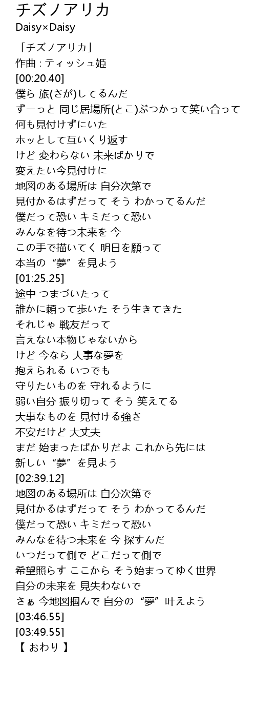 | [00:01.40] | 「チズノアリカ」 |