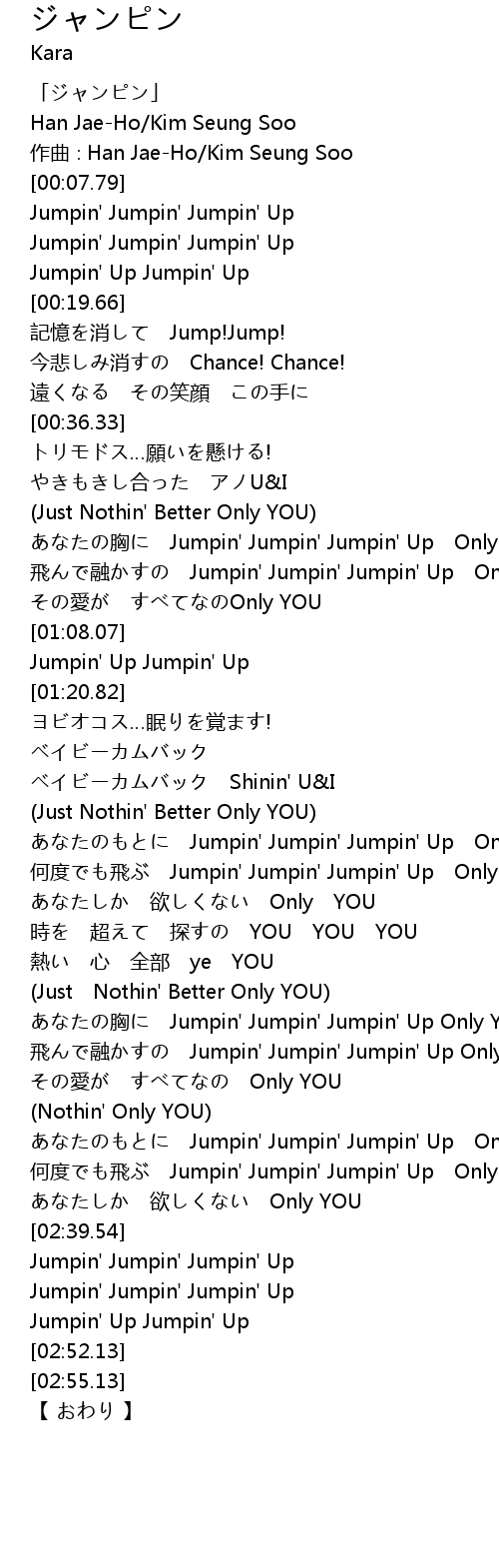 | [02:29.45] | 何度でも飛ぶ Jumpin' Jumpin' Jumpin' Up Only YOU |