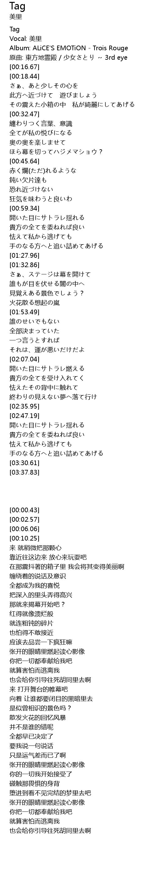 | [00:10.25] | 原曲: 東方地霊殿 / 少女さとり ~ 3rd eye |