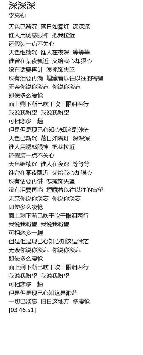 | [01:41.00] | tiān sè yǐ jiàn chén luò rì rú wù dēng shēn shēn shēn |