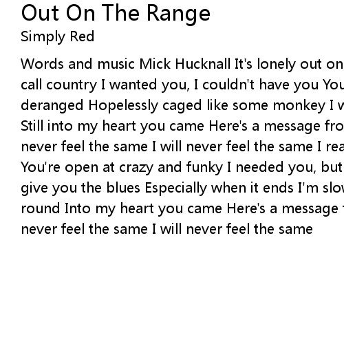 Words and music Mick Hucknall It's lonely out on the range That open space they call country I wanted you, I couldn't have you Your pills left you kind of deranged Hopelessly caged like some monkey I wanted you, I couldn't have you Still into my heart you came Here's a message from this lonely boy Who will never feel the same I will never feel the same I read you while holding the page You're open at crazy and funky I needed you, but you weren't there Happiness can give you the blues Especially when it ends I'm slowing down, can't turn you round Into my heart you came Here's a message from this lonely boy Who will never feel the same I will never feel the same |