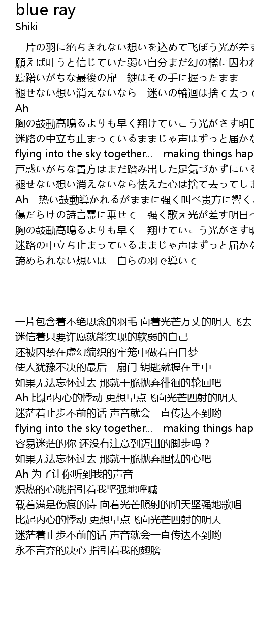 | [00:02.15] | 一片の羽に绝ちきれない想いを込めて飞ぼう光が差す明日へ |