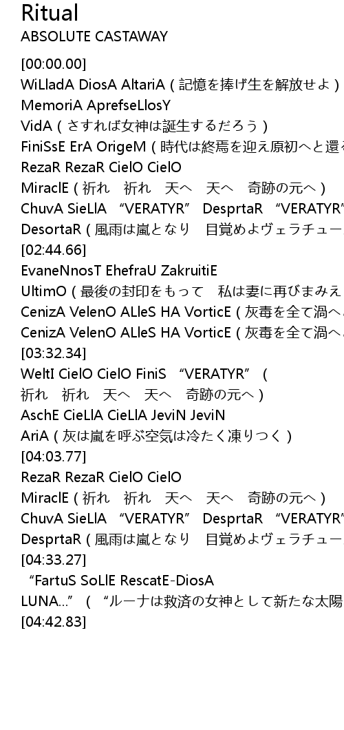 | [03:32.51] | WeltI CielO CielO FiniS “VERATYR”( 祈れ 祈れ 天へ 天へ 奇跡の元へ) |