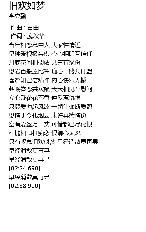 | [02:13.0] | 只有叹息旧欢似梦 早经消散莫再寻 |