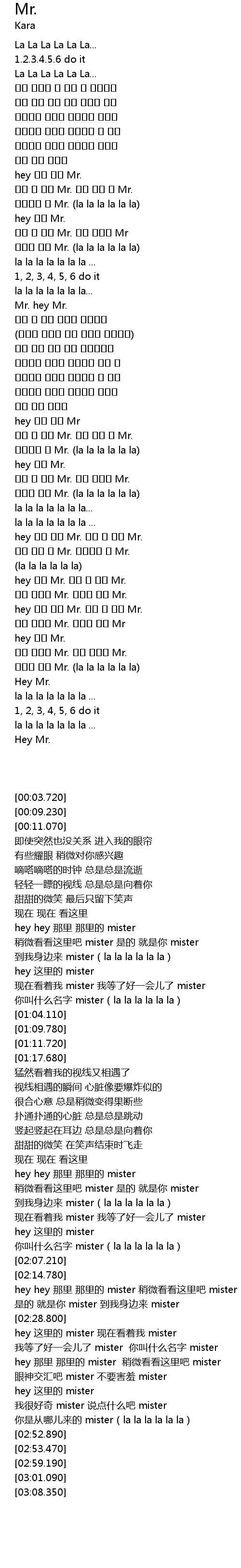 | [02:03.570] | 이름이 뭐야 Mr. (la la la la la la) |