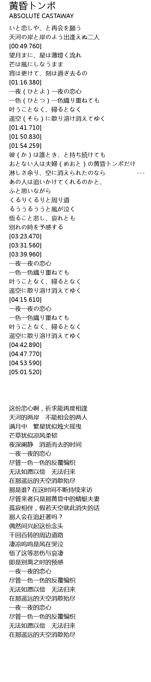 | [02:12.670] | おとない人は夫婦(めおと)の黄昏トンボだけ |