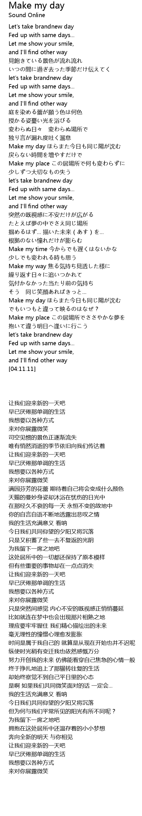 | [01:29.13] | Make my day ほらまた今日も同じ陽が沈む |