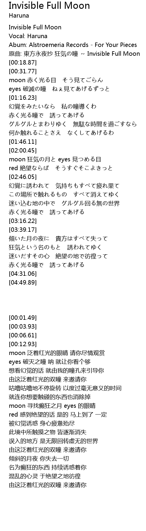 | [00:12.93] | 原曲: 東方永夜抄 狂気の瞳 ~ Invisible Full Moon |