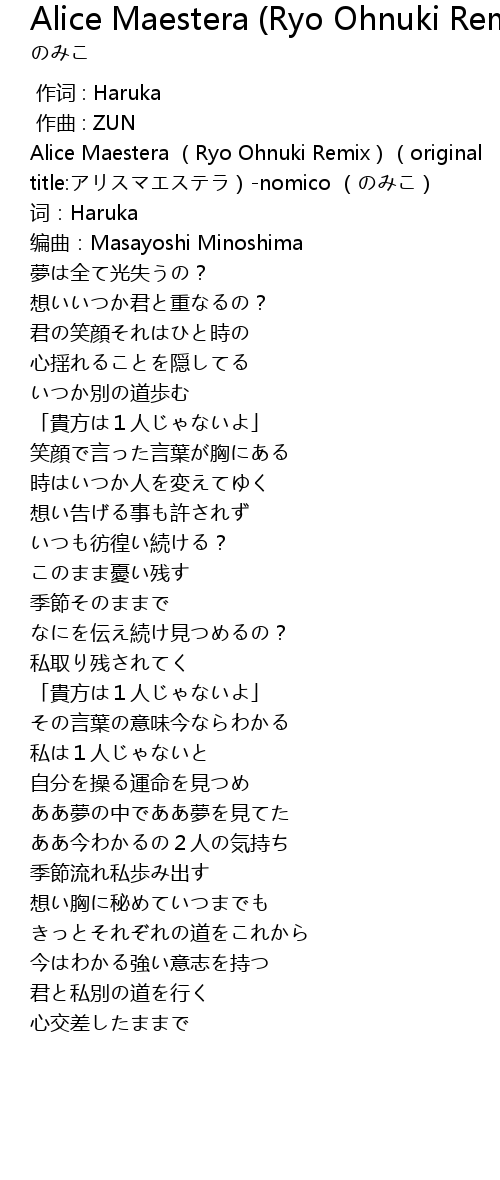 | [00:00.16] | Alice Maestera Ryo Ohnuki Remix original title: nomico |