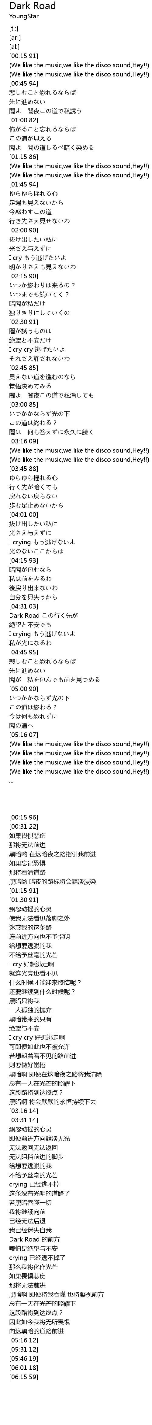 | [00:52.91] | 闇よ 闇夜この道で私誘う |