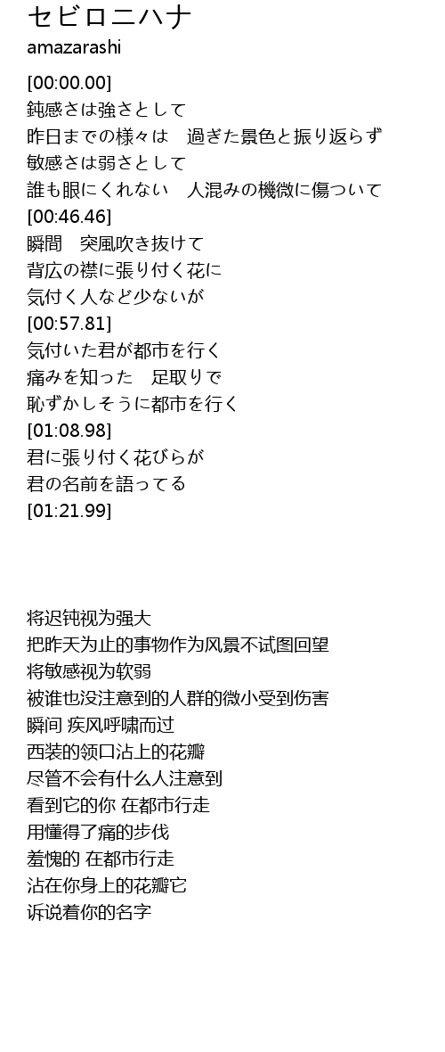 | [00:40.52] | 誰も眼にくれない 人混みの機微に傷ついて |