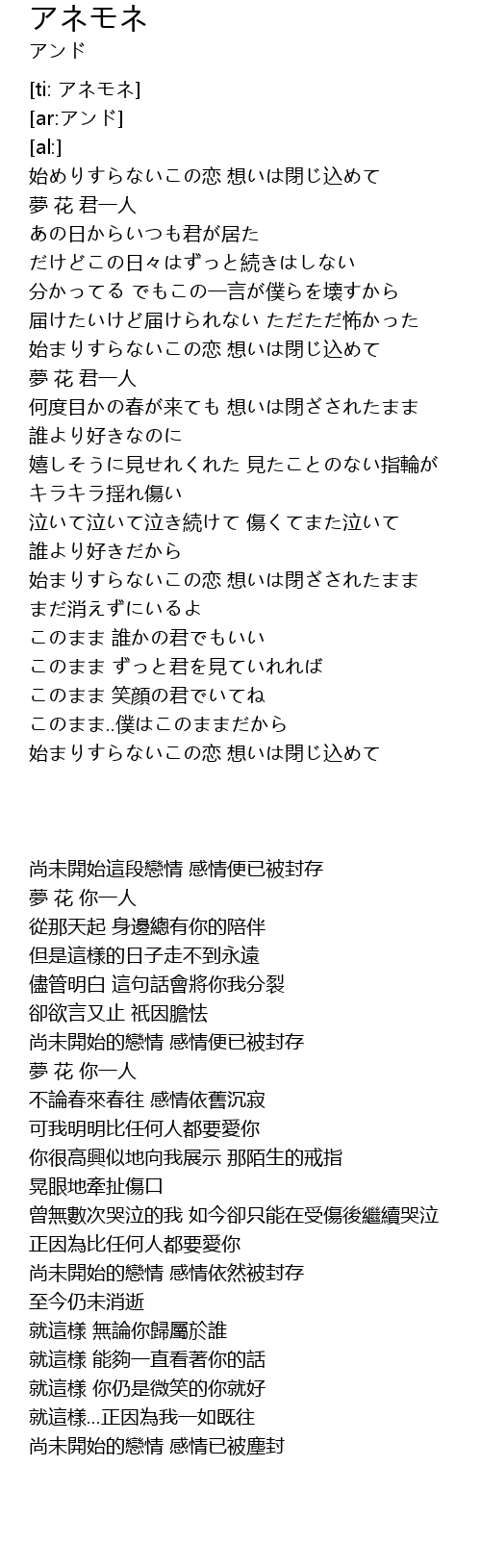 | [01:37.89] | 何度目かの春が来ても 想いは閉ざされたまま |