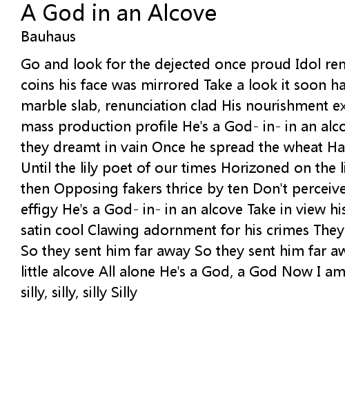 Go and look for the dejected once proud Idol remembered in stone aloud Then on coins his face was mirrored Take a look it soon hath slithered To a fractured marble slab, renunciation clad His nourishment extract from his subjects That mass production profile He's a God- in- in an alcove Once he spread the rain So they dreamt in vain Once he spread the wheat Had made garlands for his feet Until the lily poet of our times Horizoned on the line Love became the in theme then Opposing fakers thrice by ten Don't perceive his empty plea That redundant effigy He's a God- in- in an alcove Take in view his empty stool What's left is satin cool Clawing adornment for his crimes They saw they had to draw the line So they sent him far away So they sent him far away To a little alcove To a little alcove All alone He's a God, a God Now I am silly Now I am silly Silly, silly, silly, silly Silly
