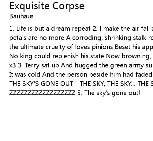 1. Life is but a dream repeat 2. I make the air fall apart Around me Now as the petals are no more A corroding, shrinking stalk remains Bereft of his blooms And the ultimate cruelty of loves pinions Beset his appearance Beset his appearance No king could replenish his state Now browning, sinking, dying A thousand deaths x3 3. Terry sat up And hugged the green army surplus bag Around his skinny waist It was cold And the person beside him had faded badly Legs apart his eyes lit up THE SKY'S GONE OUT - THE SKY, THE SKY... THE SKY'S GONE OUT 4. ZZZZZZZZZZZZZZZZZZ 5. The sky's gone out! |