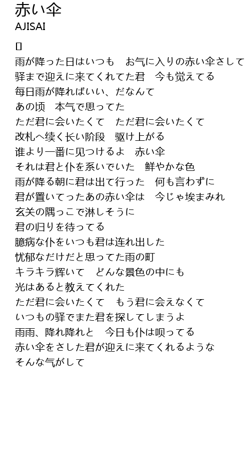 | 君が置いてったあの赤い伞は 今じゃ埃まみれ | |