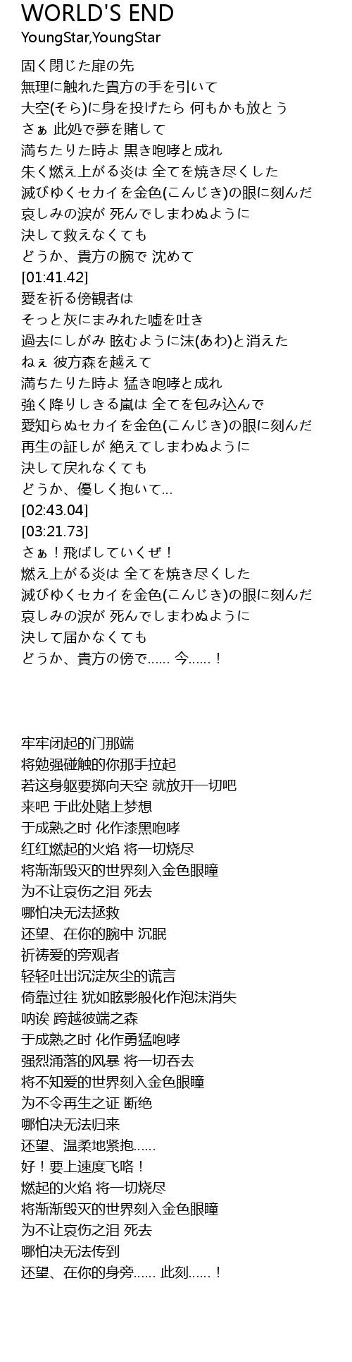 | [03:23.73] | 燃え上がる炎は 全てを焼き尽くした |